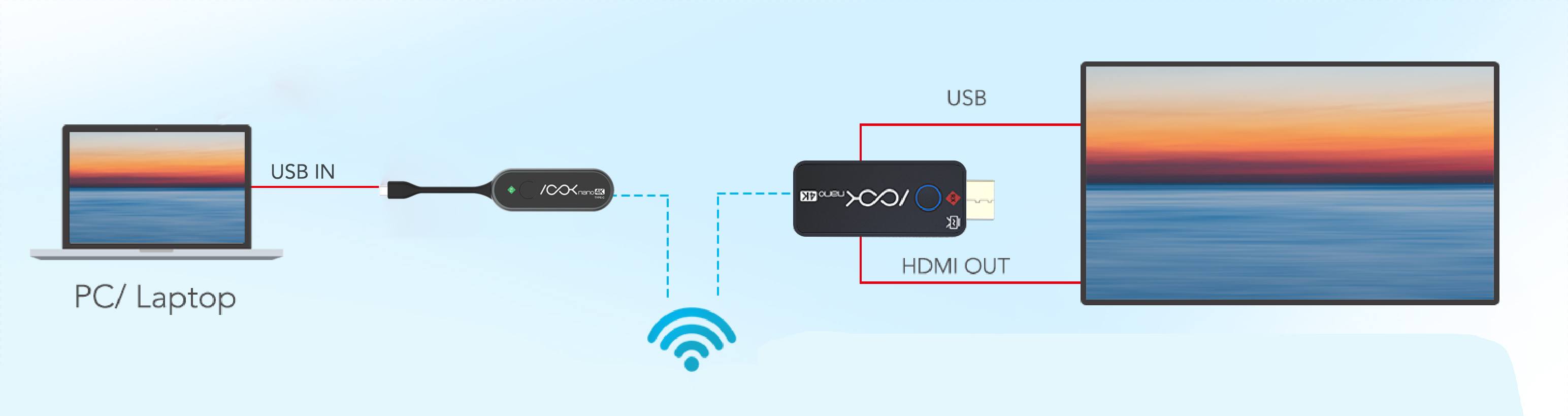 A standard ASK nano 4K (USB-C version) is a combination of one transmitters and one receiver, the receiver is connected to a projector or display, and the transmitter is connected with PC or any device with HDMI jack, after connected, users just need to wait the screen streaming to the display automatically.