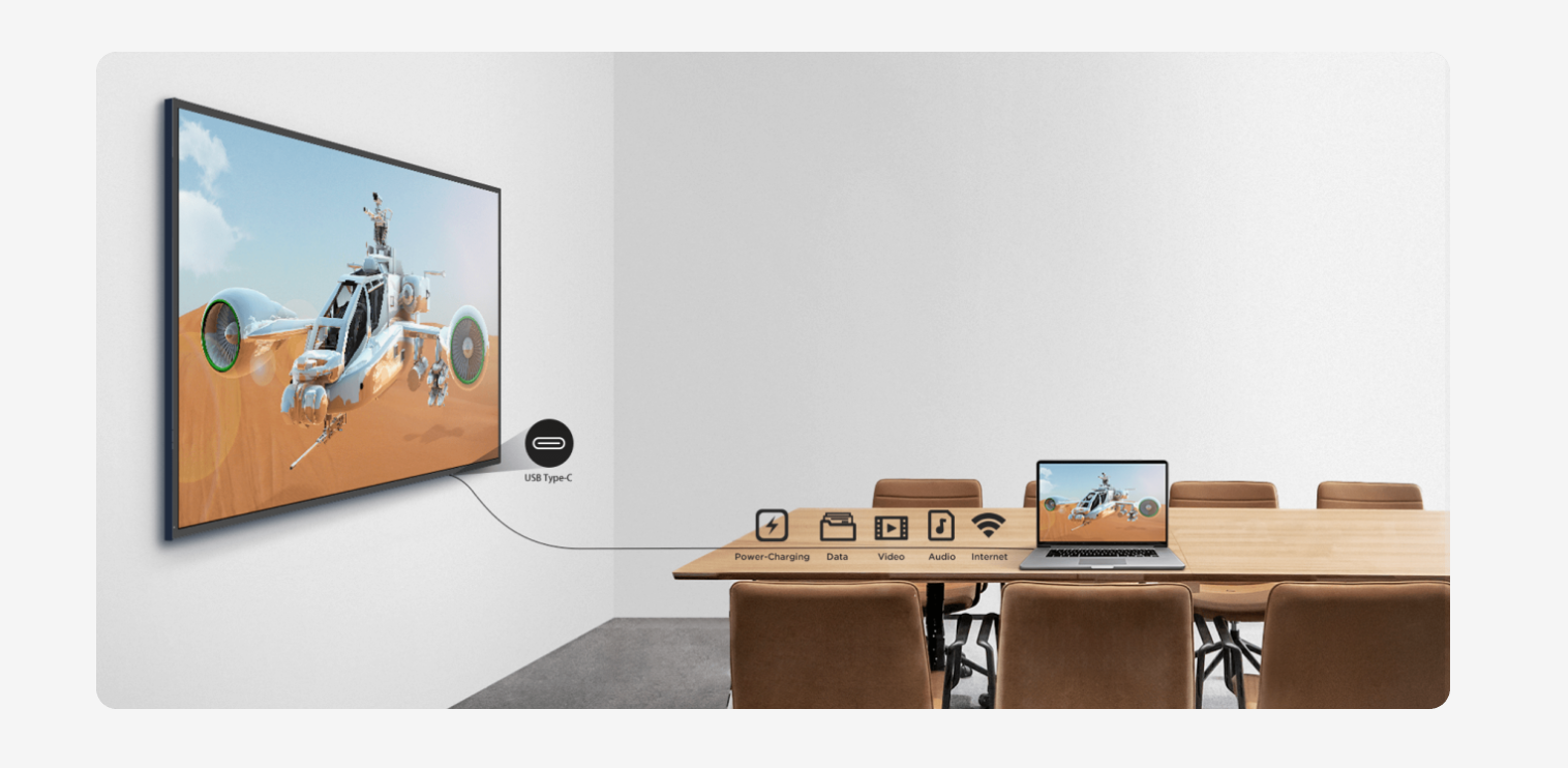 The full-function USB Type-C supports ScreenShare, making content sharing easy. NetworkShare allows for effortless network sharing, and the 65W power output enables connected PC charging that is faster than a typical charger.